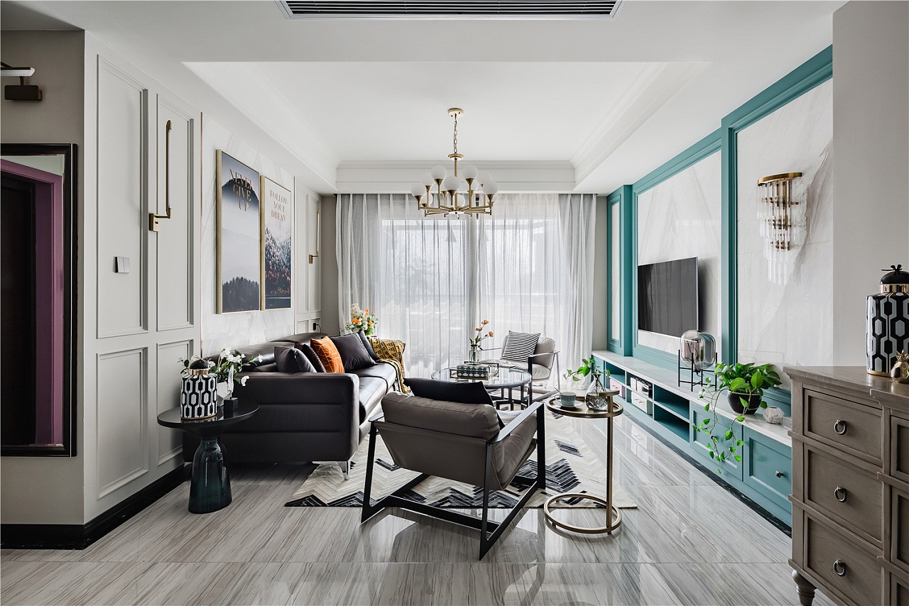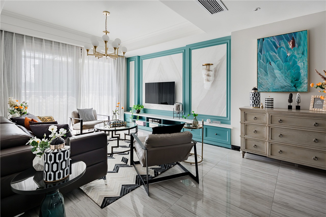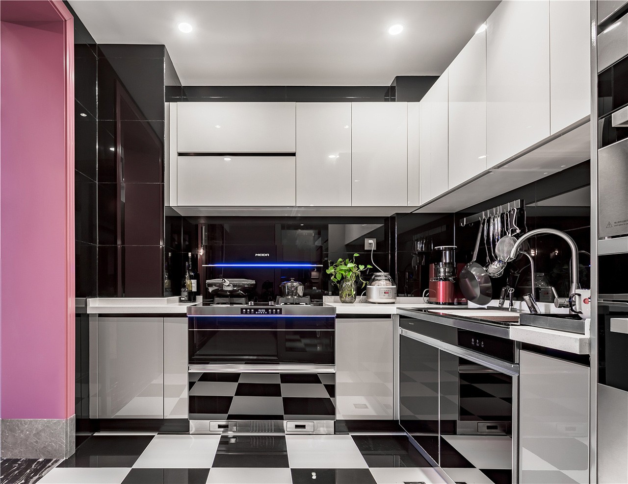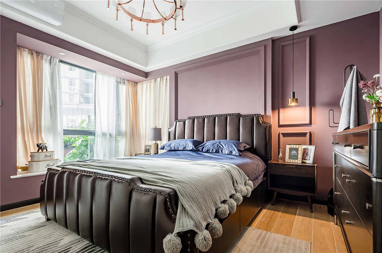 入戶門廳以白色作為基調,紫色門套作為點綴,整體空間驚艷脫俗。地板選用更易清洗、更耐磨損的全瓷磚鋪設,大理石貼墻與地面一起,把客餐廳的整體基調定在了一個雅字上,典雅大氣。深色的皮質沙發把整個客廳的冷色調提了起來,像一杯香醇的咖啡,迅速捂暖了大理石的冷硬。主臥室淺棕色、黑色、紫色、白色,四大色塊干凈利落的劃分出主臥的空間層次,床頭細節的處理使空間更有縱深感。主衛生間銀白龍和爵士白的采用與客廳的整體色調一脈相承,三種切割成不同大小的瓷磚拼接造型,使小小一方天地也能層次分明。