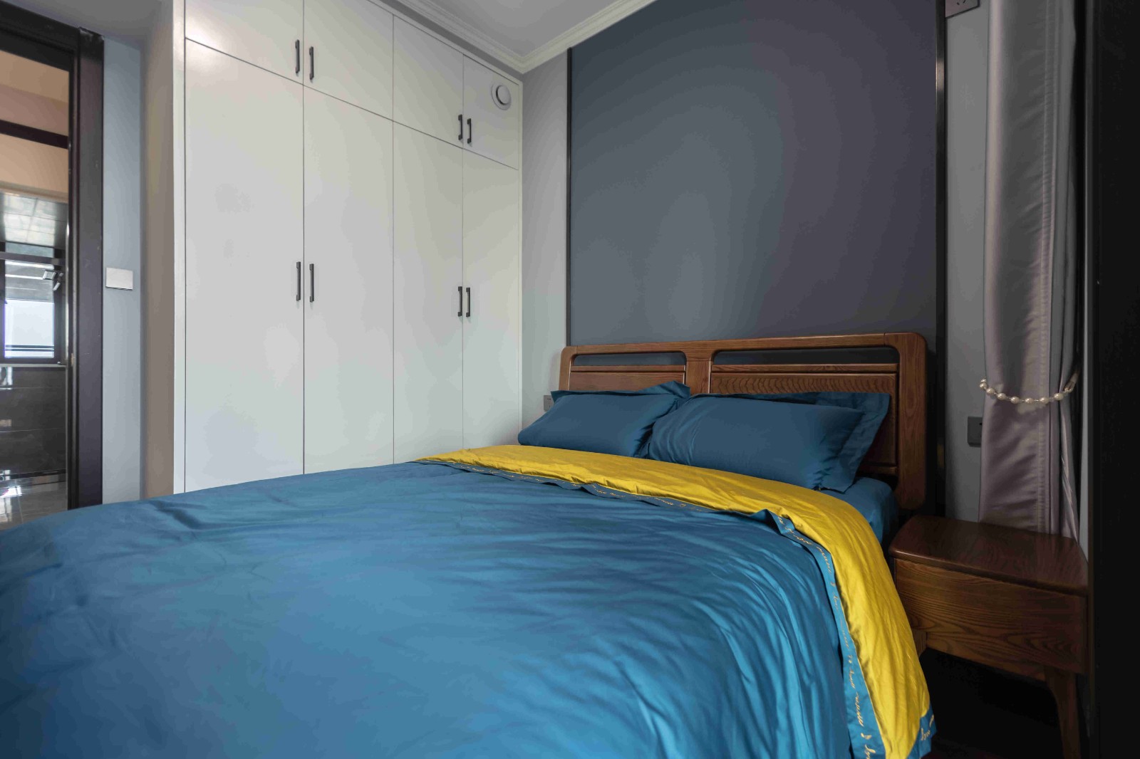 在原戶型的基礎上,并沒有做太多的改動。靠窗增加了一排定制柜子,既能做梳妝臺又能放置東西。最引人注目的是床頭背景墻,充滿了藝術氣息,深邃幽遠。