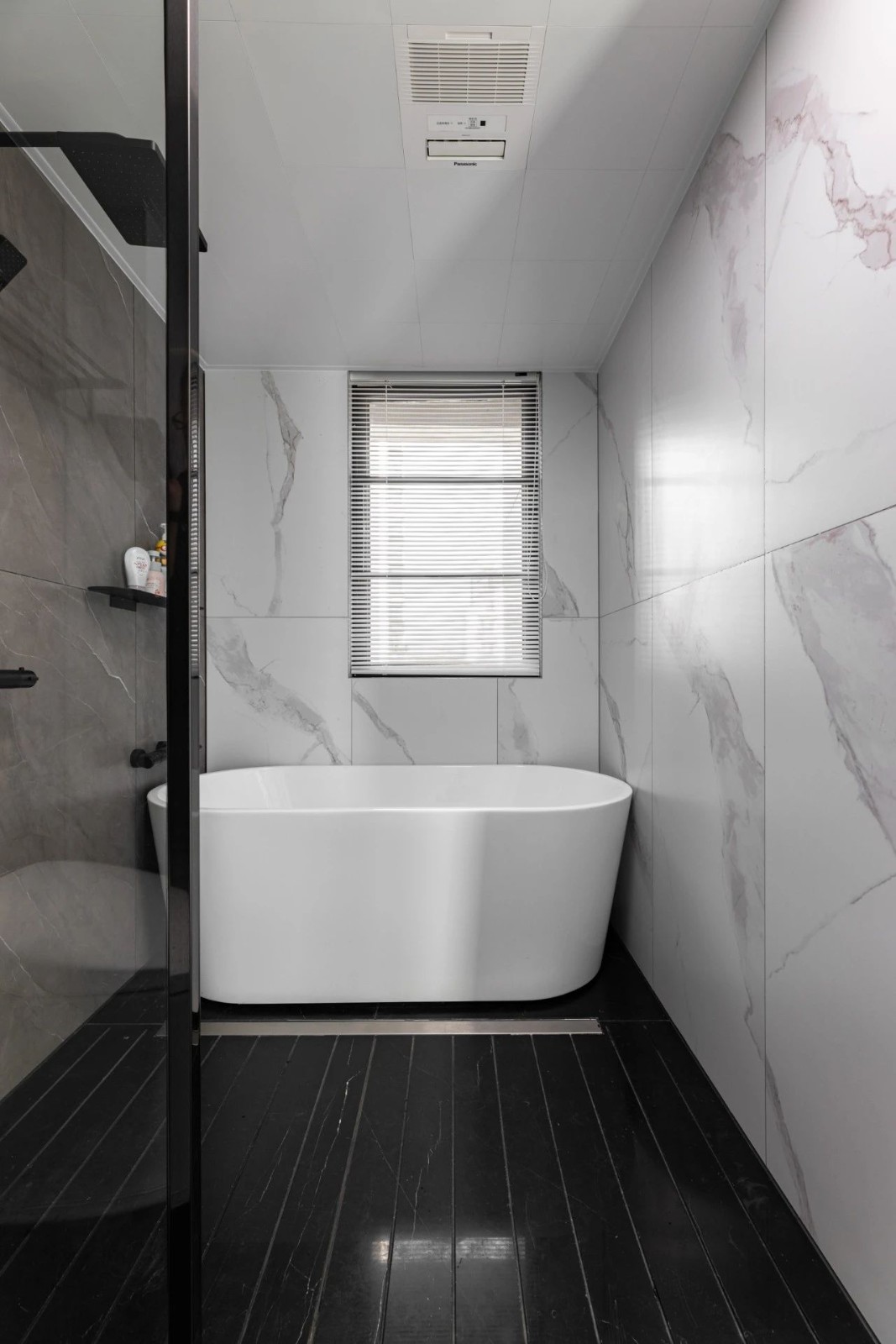 淋浴區(qū)地面做成石材拉槽設(shè)計,下水快又防滑,墻面的壁龕可放置洗浴用品,節(jié)省空間,拿取又方便。